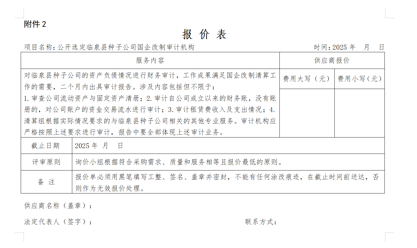 附件2:审计机构报价表