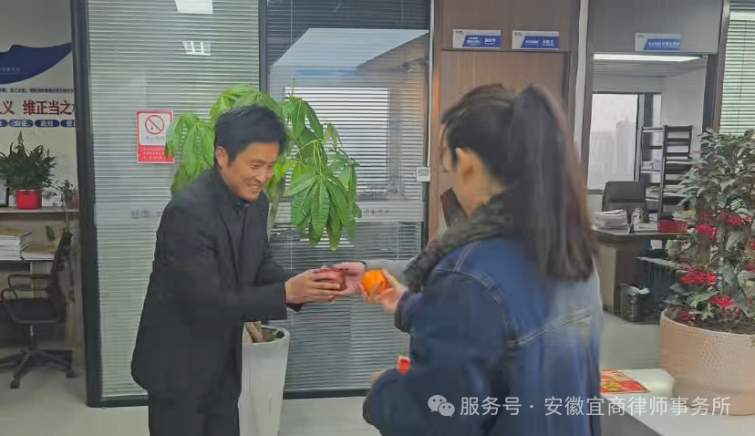 仪式现场,律所管理人员化身“福气使者”,为每一位同仁送上精心准备的苹果与橘子。苹果寓意 “平安顺遂”,愿大家新岁无虞、工作顺遂;橘子象征 “吉祥如意、事业红火”,寄托着对律所业绩蒸蒸日上、团队发展顺风顺水的美好祝愿。
