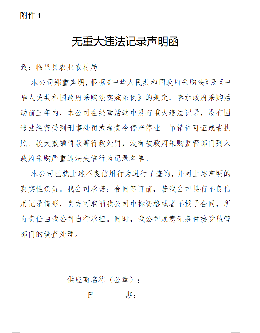附件1:无重大违法记录声明函及承诺书